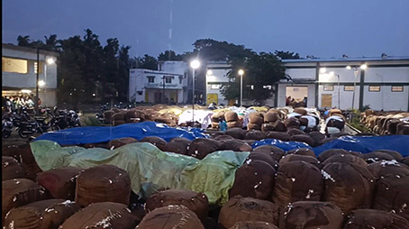 இந்நிலையில் 3600- க்கும் மேற்பட்ட பருத்தி மூட்டைகளுடன் மிகுந்த எதிர்பார்ப்புடன் விவசாயிகள் நேற்று ஏலத்தில் கலந்து கொண்டனர். இருப்பினும் எதிர்பார்த்த அளவு கூடுதல் விலை கிடைக்காமல் குறைந்த பட்சம் ரூ.46 முதல் அதிகபட்சம் ரூ.63 வரை ஒரு கிலோ பருத்தி விலை போனது. அதனால் விவசாயிகள் மிகுந்த மனவேதனைக் குள்ளானதாக கூறப்படுகிறது. மேலும், ஏலம் முடிந்த பின்னர் மீதமுள்ள பருத்தி மூட்டைகள், அடுத்த ஏலத்திற்காக உள்ள பருத்தி மூட்டைகள் என சுமார் 2 ஆயிரத்திற்கும் மேற்பட்ட பருத்தி மூட்டைகள் திறந்த வெளியில் அடுக்கி வைக்கப்பட்டிருந்தது. அப்போது மாலையில் திடீரென பெய்த கனமழையால் 2000 பருத்தி மூட்டைகள் நனைந்து சேதமடைந்தன.