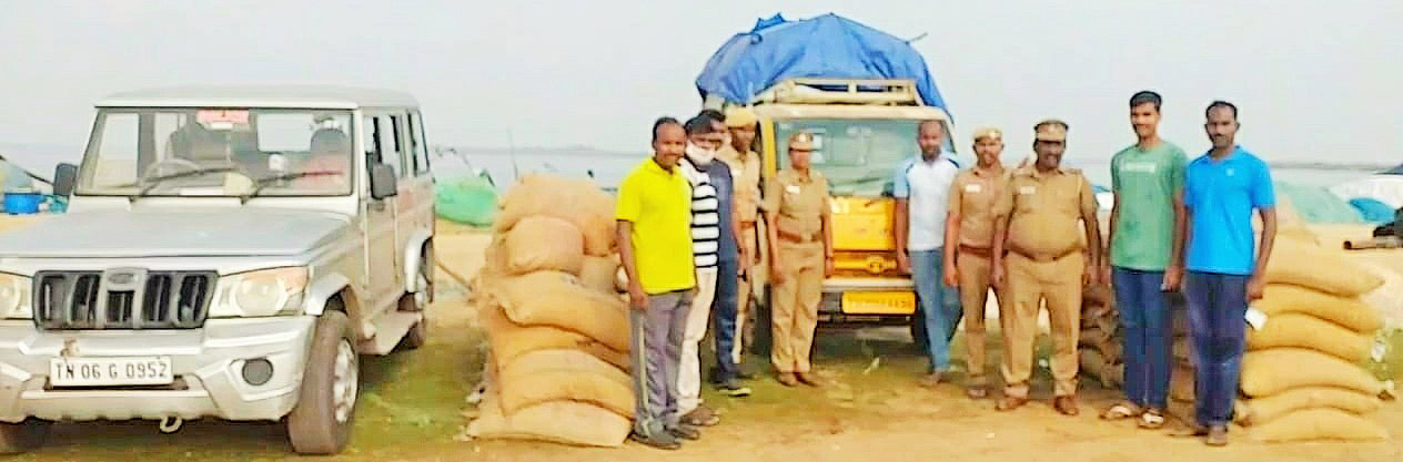 திருவள்ளூர் மாவட்டம், பழவேற்காடு அருகே கூனங்குப்பத்தில் இருந்து சுமார் 3 டன் ரேஷன் அரிசி ஆந்திராவுக்கு படகு மூலம் கடத்தப்படுவதாக கடலோர பாதுகாப்புபடை குழுவிற்கு கிடைத்த தகவலின் பேரில், கூடுதல் இயக்குனர் சந்தீப் மிட்டல் உத்தரவின் பேரில். கடலோர பாதுகாப்பு குழுமம் ஆய்வாளர் சுரேஷ்குமார். மற்றும் உதவியாளர் மாலதி ஆகியோர் தலைமையிலான குழுவினர். அதிரடியாக ரேஷன் அரிசி கடத்தல் நடைபெறும் இடத்திற்கு விரைந்து வந்தனர்.