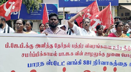 அப்போது ஜனநாயகத்தின் குரல்வலையை நசுக்கும் நோக்கோடு நாடாளுமன்றத் தேர்தலில் தில்லுமுல்லு செய்வதற்காக மோடி தலைமையிலான பாஜக அரசு பல்வேறு நடவடிக்கைகளில் ஈடுபட்டு வருவதாகவும், அதன் ஒரு பகுதியாக நடைபெற்றுள்ள தேர்தல் நன்கொடை பத்திர முறை கேட்டிற்கு ஆதரவாக பாரத் ஸ்டேட் வங்கி செயல்படுவதாக குற்றம் சாட்டி ஆர்ப்பாட்டத்தில் ஈடுபட்டவர்கள் கண்டன முழக்கங்களை எழுப்பினர்.