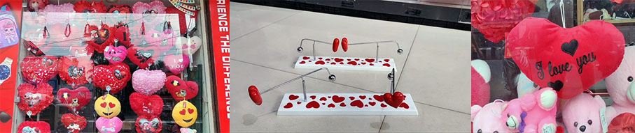 காதலர்களுக்காவே வித்தியாசமான பரிசு பொருட்கள் தஞ்சை கடைகளில் விற்பனைக்கு வந்துள்ளன. டெடிபேர் பொம்மைகள், இதய வடிவிலான சிறிய வெல்வெட் தலையணைகள், பியூட்டி ஸ்மைல் என எழுதப்பட்ட வண்ண ஜெல்லி மிட்டாய்கள், டெய்ரி மில்க் இதயம், உதடு போன்ற வடிவங்களில் சாக்லெட்டுகள், சுற்றி வந்து ஒட்டி கொள்ளும் இதய காந்தங்கள், முகம் பார்க்கும் கண்ணாடிகள், வண்ண ஒளி யோடு இசையுடன் பொம்மைகள், உள்ளங்கையில் வைத்து விரல்களால் தொட்டால் பிரஸர் போல் ஏறும் டாய்ஸ், குடிநீர் பாட்டில்கள் என பல வடிவங்களில் புதிய வரவாக வந்துள்ள பொருட்களை காதலர்கள் ஆர்வமுடன் தேர்ந்தெடுத்து ரசித்து வாங்கி செல்கின்றனர்.