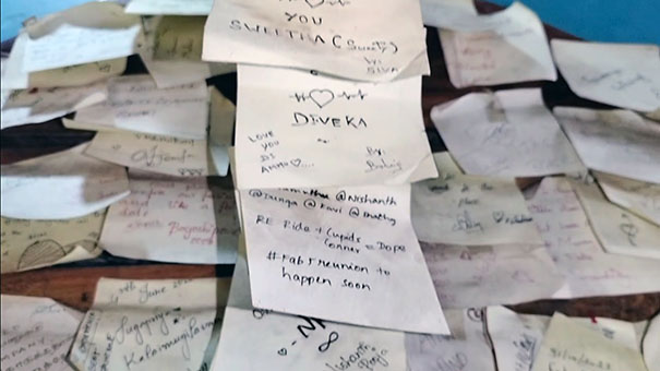 சிலர் காதலிக்க ஆரம்பித்த வருடம் நாள் மாதம் ஆகியவற்றுடன் தங்கள் பெயரையும் துண்டு சீட்டில் எழுதி ஒட்டி செல்கின்றனர். மீண்டும் இதே நாளில் இருவரும் இணைந்து வந்து பூட்டை திறப்பார்களாம். கடிதத்தில் எழுதி காதல் வளர்ந்த காலம் மாறி பூட்டுக்கு வந்து விட்டது.