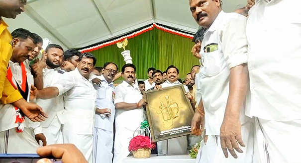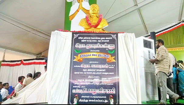 இவ்விழாவில் பங்கேற்ற தமிழக முன்னாள் முதல்வரும், அதிமுக பொதுச் செயலாளரும், தற்போதைய எதிர்க்கட்சித் தலைவருமான எடப்பாடி கே.பழனிச்சாமி திருவுருவச் சிலையினை திறந்து வைத்து சிறப்புரை ஆற்றினார்.