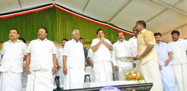 கும்பகோணம் மாநகரம் அருகேவுள்ள பாபநாசத்திற்கு, மறைந்த முன்னாள் வேளாண்துறை அமைச்சர் துரைக்கண்ணுவின் திருவுருவச்சிலை திறப்பு விழாவிற்கு வருகை தந்த அதிமுக பொதுச்செயலாளர் எடப்பாடி கே. பழனிச்சாமிக்கு அக்கட்சி தொண்டர்கள் அவருக்கு பிரம்மாண்ட வரவேற்பளித்தனர்.
