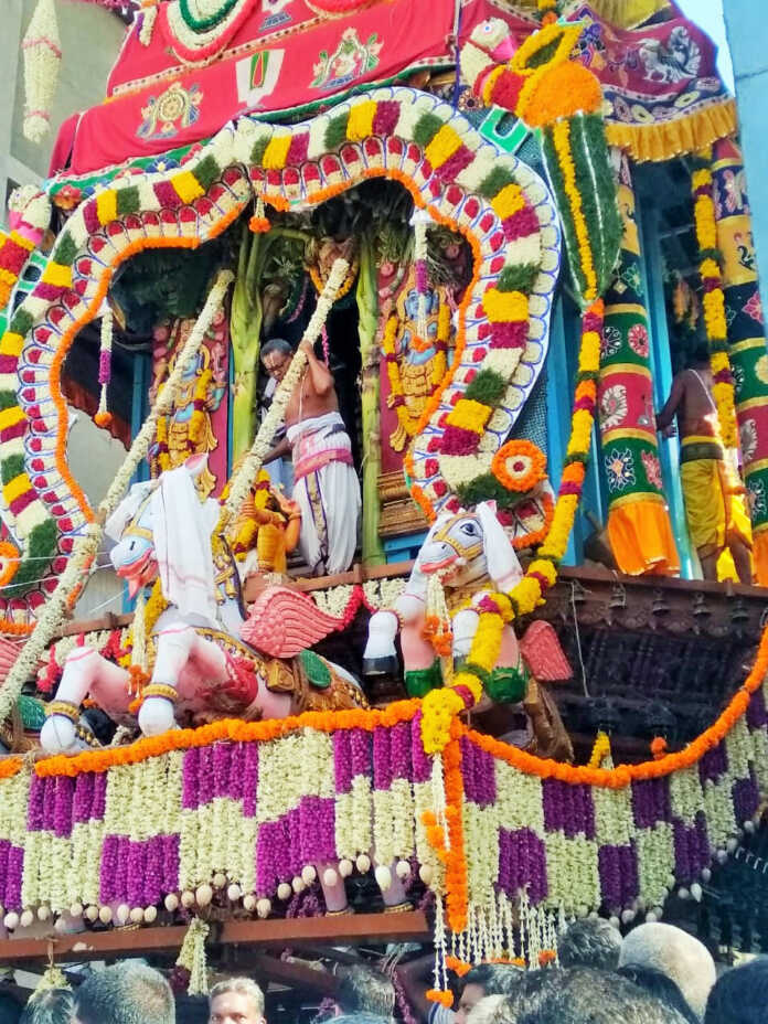 நகரத்தின் முக்கிய வீதிகளில் பகவான் வரதராஜ பெருமாள் தேரில் பவனி வந்து பக்தர்களுக்கு காட்சி அளித்தார். பக்தகோடிகள் கோவிந்தா கோவிந்தா என விண்ணை முட்ட முழங்க முறையாக தெருவலம் வந்து இறுதி எல்லை வந்துச் சேர்ந்தது, இறைவன் அமர்ந்து வந்து வண்ணமலர்களால் அலங்கரிக்கப்பட்ட மரத்திலான தேர்…