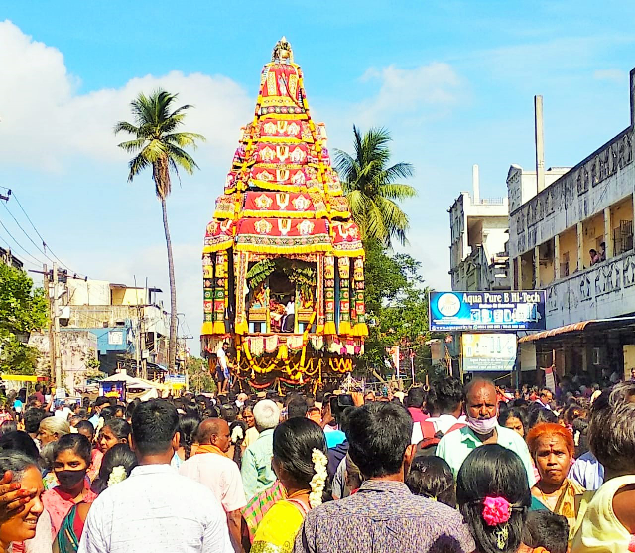 காலை 8:40 மணி அளவில் பொன்னேரி தொகுதி சட்டமன்ற உறுப்பினர் துரை சந்திரசேகர் முன்னாள் சட்டமன்ற உறுப்பினர்கள் பலராமன். பொன்ராஜா .மீஞ்சூர் ஒன்றிய பெருந்தலைவர் ரவி. அறங்காவலர் சுப்பிரமணி. பேரூராட்சி தலைவர் ருக்மணி மோகன்ராஜ் .துணை தலைவர் அலெக்சாண்டர் .தொழிலதிபர் தமிழ்உதயன் .உள்ளிட்டவர்கர்களோடு ஆயிரக்கணக்கான பக்தர்கள் ஒன்று கூடி வடம் பிடித்து இழுக்க தேர் புறப்பட்டது.