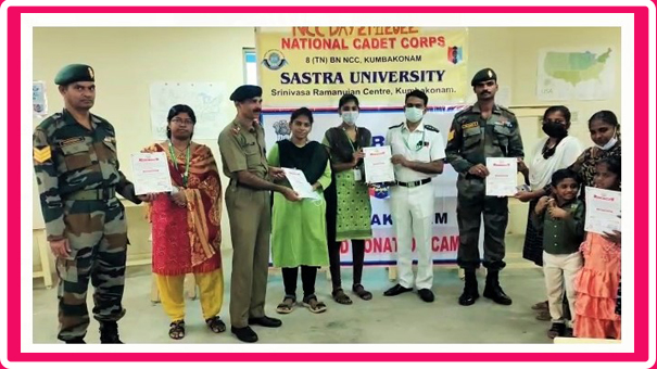 இந்நிலையில் தேசிய மாணவர் படையின் 75 வது ஆண்டு விழாவினை முன்னிட்டு கும்பகோணம் சாஸ்திரா பல்கலைக்கழகத்தில், இரத்த தானம் முகாம் நடைபெற்றது.