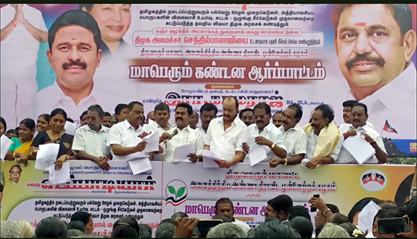 திருவாரூரில் இன்று லஞ்சம் மற்றும் ஊழல் வழக்கில் கைது செய்யப்பட்டுள்ள அமைச்சர் செந்தில் பாலாஜியை பதவி நீக்கம் செய்ய வலியுறுத்தியும், மற்றும் திமுக அரசைக் கண்டித்தும் திருவாரூர் புதிய ரயில் நிலையம் முன்பாக முன்னாள் அமைச்சரும் மாவட்ட அதிமுக செயலாளருமான இரா.காமராஜ் தலைமையில் கண்டன ஆர்ப்பாட்டம் நடைபெற்றது.