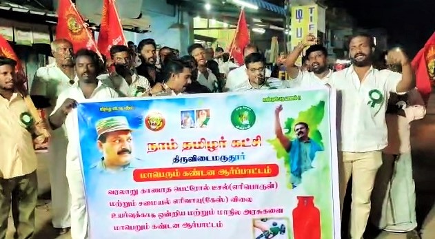 கும்பகோணம் அருகேவுள்ள நாச்சியார்கோவிலில் பெட்ரோல் டீசல் சமையல் எரிவாயு மற்றும் சொத்து வரிவுயர்வையும், தற்போது தமிழகத்தில் ஏற்பட்டுள்ள மின் வெட்டை கண்டித்தும் நாம் தமிழர் கட்சி சார்பில் மத்திய மாநில அரசுகளுக்கு எதிராக கண்டனங்களை தெரிவித்த ஆர்ப்பாட்டம் நடைபெற்றது.
