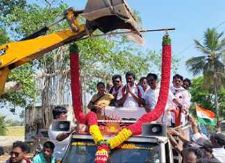 ஜேசிபி இயந்திரம் மூலம் தூவப்பட்ட 50 கிலோ ரோஜாப்பூக்கள்.. கிரேன் மூலம் மிகப்பெரிய மாலை அணிவித்து திமுக வேட்பாளருக்கு உற்சாக வரவேற்பளித்த பொதுமக்கள்..
