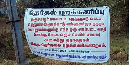 ஒரத்தநாடு அருகே அடிப்படை வசதி கேட்டு தேர்தலை புறக்கணிப்பதாக கிராம மக்கள் அறிவித்துள்ளனர். மேலும் தங்கள் கிராமத்தில் சரியான சாலை, குடிநீர் உள்ளிட்ட எந்த அடிப்படை வசதியும் இல்லை எனவும், அதனால் நாங்கள் எதிர்வரும் நாடாளுமன்றத் தேர்தலை புறக்கணிக்கிறோம். எனவும் அதனால் வேட்பாளர்கள் யாரும் எங்கள் பகுதிக்கு வாக்குக் கேட்டு வர வேண்டாம் என, தஞ்சாவூர் மாவட்டம், ஒரத்தநாடு அருகே உள்ள தெலுங்கன்குடிக்காடு, வள்ளுவர்குடி, நத்தம் கிராமமக்கள் அறிவிப்பு செய்து சுவரொட்டிகளை ஒட்டியுள்ளனர். அதனால் அப்பகுதி முழுவதும் பரபரப்பு நிலவி வருகிறது.