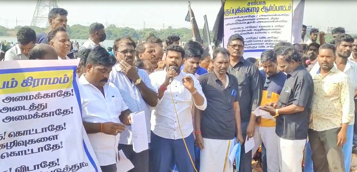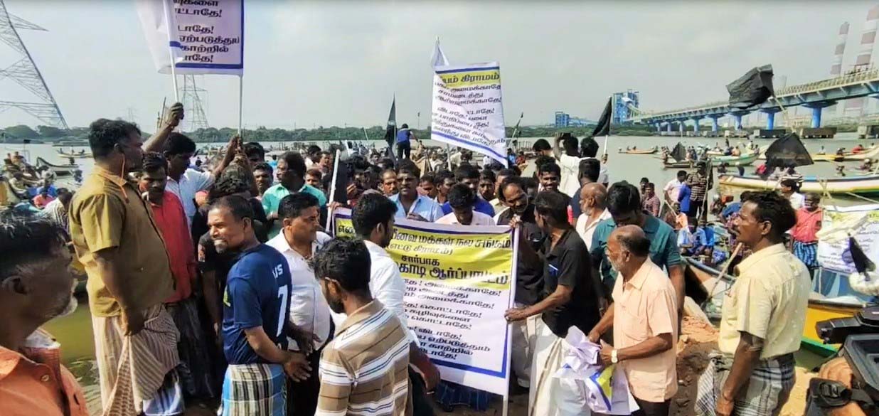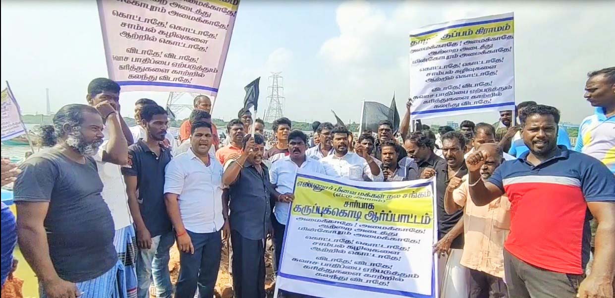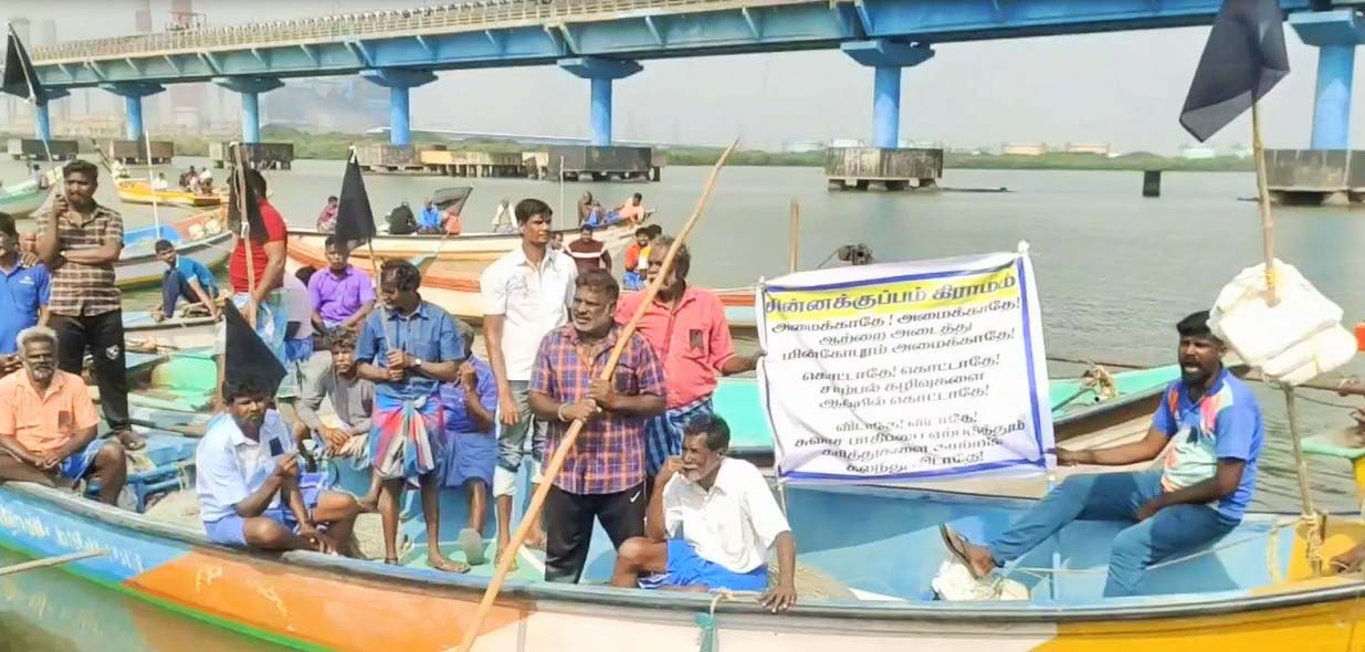 திருவள்ளூர் மாவட்டம் வடசென்னை எண்ணூர் உப்பங்கழி கொசஸ்தலை ஆற்றில் மின் கோபுரம் அமைக்கும் பணிக்கு எதிர்ப்பு தெரிவித்து அப்பகுதியில் உள்ள மீனவர்கள் சங்கங்கள் எதிர்ப்பு தெரிவித்து கையில் கருப்பு கொடிகள் ஏந்தி போராட்டத்தில் ஈடுப்பட்டு வருகின்றனர்.