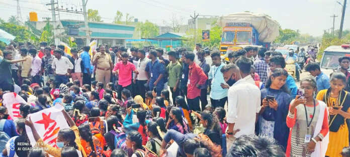 இந்நிலையில் மாணவிக்குஞ பாலியல் தொல்லை கொடுத்த உதவி பேராசிரியர் மகேந்திரனை பணிநீக்கம் செய்ய வேண்டும், அரசு ஊழியர்களுக்கு வழங்கப்படும் எந்த சலுகையும் அவருக்கு வழங்க கூடாது பள்ளி கல்லூரிகளில் நடைபெறும் பாலியல் வன்கொடுமைகளை தடுக்க அனைத்து பள்ளி கல்லூரிகளிலும் பல்வேறு துறை சார்ந்த உறுப்பினர்கள் அடங்கிய பெண்கள் குறைதீர்ப்பு குழுவை அமைக்க வேண்டும், பாலியல் தொல்லை தொடர்பாக பாதிக்கப்பட்ட மாணவிகள் பலமுறை புகார் அளித்தும் நடவடிக்கை எடுக்காமல் உதவி பேராசிரியருக்கு துணைபோன கல்லூரி முதல்வரை தற்காலிக பணியிடை நீக்கம் செய்ய வேண்டும் உள்ளிட்ட பல்வேறு கோரிக்கைகளை வலியுறுத்தி வகுப்புகளைப் புறக்கணித்து மாணவர்கள் கல்லூரி நுழைவு வாயில் முன்பாக திடீர் சாலை மறியல் போராட்டத்தில் ஈடுபட்டனர்.