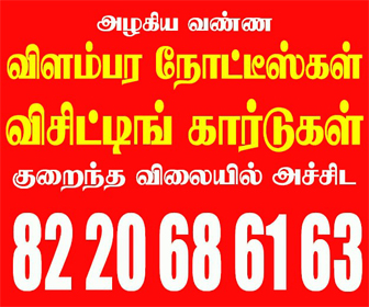 ஆட்கள் தேவை | கல்யாண வரன் | மருத்துவம் | வணிகம் | பைனான்ஸ் | ரியல் எஸ்டேட் | கல்வி | சேல்ஸ் | ஆட்டோ மொபைல் | அஸ்ட்ராலஜி | சர்வீஸ் மற்றும் அனைத்துவிதமான விளம்பரங்களுக்கு ஒரு மாதம் முழுவதும் ரூ.3000 ஆயிரம் மட்டுமே! * நிபந்தனைக்குட்பட்டது.