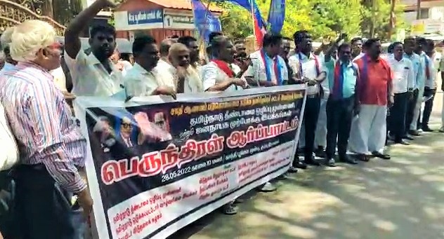 ஜனநாயக முற்போக்கு இயக்கங்கள் சார்பில் தமிழக முழுவதும் பெருந்திரள் ஆர்ப்பாட்டம் நடைபெற்று வருகிறது. அதன் ஒரு பகுதியாக கும்பகோணம் காந்தி பூங்கா முன்பு தீண்டாமை ஒழிப்பு முன்னணி மாநில துணைச்செயலாளர் சின்னை பாண்டியன் தலைமையில் கண்டன ஆர்ப்பாட்டம் நடைபெற்றது.