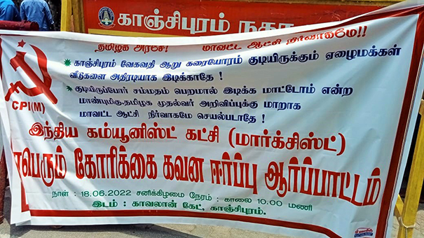 மேலும் அந்த ஆர்ப்பாட்டத்தில் ஈடுப்பட்டவர்கள் காஞ்சிபுரம் வேகவதி ஆறு கரையோரம் குடியிருக்கும் ஏழைமக்கள் வீடுகளை அதிரடியாக இடிக்காதே, குடியிருப்போர் சம்மதம் பெறாமல் இடிக்க மாட்டோம் என தமிழக முதல்வர் அறிவிப்புக்கு மாறாக காஞ்சிபுரம் மாவட்ட நிர்வாகமே செயல்படாதே என்ற முழக்கங்களை எழுப்பி தமிழக அரசுக்கு எதிராகவும், மாவட்ட நிர்வாகத்திற்க்கும் எதிராகவும் 500-க்கும் மேற்பட்டோர் ஆர்பட்டத்தில் ஈடுபட்டனர்.