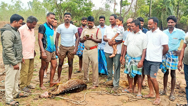 திருவள்ளூர் மாவட்டம் கும்மிடிப்பூண்டி ஒன்றியம் ஈகுவார் பாளையம் ஊராட்சிக்குட்பட்ட காரம்பேடு கிராமத்தில் கிணற்றில் புள்ளிமான் ஒன்று மிதப்பதாக மாடு மேய்த்துக் கொண்டிருந்த பெண் ஒருவர் கிராம மக்களுக்கு தகவல் தெரிவித்துள்ளார்.
