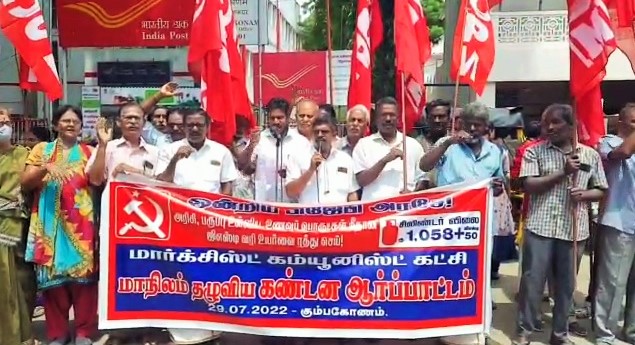 கும்பகோணத்தில் மார்க்சிஸ்ட் கம்யூனிஸ்ட் கட்சியின் சார்பில் மத்திய அரசு விதித்துள்ள அத்தியாவசிய பொருட்கள் மீதான ஜிஎஸ்டி வரியை ரத்து செய்ய கோரி கண்டன ஆர்ப்பாட்டம் நடைபெற்றது.