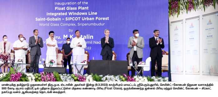 முதலமைச்சர் மு.க. ஸ்டாலின் இன்று (9.3.2022) காஞ்சிபுரம் மாவட்டம், ஸ்ரீபெரும்புதூரில், செயின்ட்-கோபைன் நிறுவன வளாகத்தில் சுமார் 500 கோடி ரூபாய் மதிப்பீட்டில் சுமார் 200 நபர்களுக்கு வேலைவாய்ப்பு வழங்கிடும் வகையில் செயின்ட்-கோபைன் நிறுவனத்தால் நிறுவப்பட்டுள்ள மிதவை கண்ணாடி பிரிவு (Float Glass), ஒருங்கிணைந்த ஜன்னல் பிரிவு மற்றும் செயின்ட் கோபைன் – சிப்காட் நகர்ப்புற வனம் ஆகியவற்றை தொடங்கி வைத்தார்.