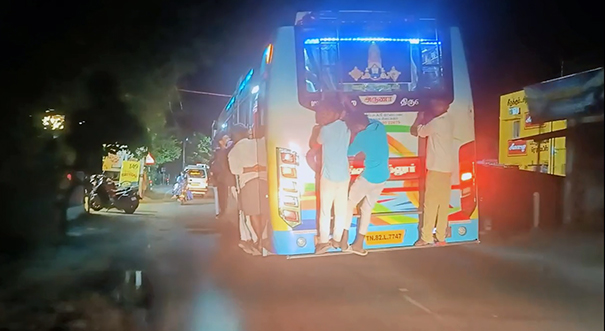 இந்நிலையில் திருவாரூர் அருகே நேற்று இரவு சேந்தமங்கலம் பகுதியில் ஒரு தனியார் பேருந்தில் இளைஞர்கள் சிலர் பேருந்தின் பின்பக்க ஏணியில்  தொங்கியவாறு பயணம் செய்தனர்.
