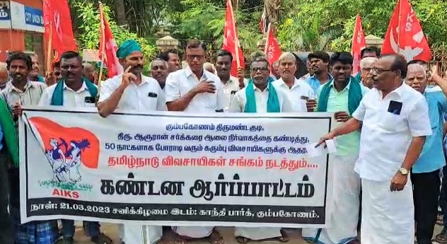 கும்பகோணம் அருகாமையில் உள்ள திருமண்டங்குடி திருஆரூரான் சர்க்கரை ஆலை நிர்வாகம், விவசாயிகளுக்கு சுமார் ரூ.112 கோடி மதிப்பிலான நிலுவைத் தொகையினை வழங்காமலும், மேலும், சுமார் 6 ஆயிரம் விவசாயிகள் பெயரில் மோசடியாக, ரூ.300 கோடி மதிப்பீலான தொகையினை 12 வங்கியிலிருந்து கடனாகப் பெறப்பட்டதாகவும், மேலும் அதன் மூலம் விவசாயிகளை கடனாளியாக மாற்றியுள்ளதாகவும் கரும்பு விவசாயிகள் தரப்பில் தெரிவிக்கப்படுகிறது.