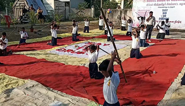 நோபல் புக் ஆப் ரெக்கார்ட் போதைக்கு எதிரான விழிப்புணர்வு சிலம்பாட்ட நிகழ்வை உலக சாதனையாக பதிவு செய்தது. தொடர்ந்து மயிலாடுதுறை மதுவிலக்கு பிரிவு காவல் ஆய்வாளர் அன்னை அபிராமி தலைமையில் மாணவர்கள் போதை பொருளுக்கு எதிரான விழிப்புணர்வு உறுதிமொழியை எடுத்துக் கொண்டனர். பின்னர் சிறப்பு அழைப்பாளர் மயிலாடுதுறை எம்பி ராமலிங்கம் பதக்கங்கள் கேடயம் சான்றிதழ்களை போன்றவற்றை மாணாக்கர்களுக்கு வழங்கி பாராட்டு தெரிவித்தார்.