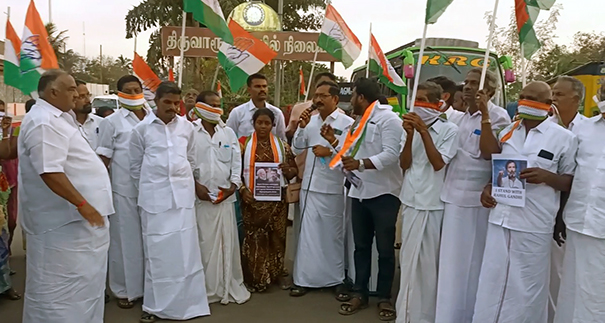திருவாரூர் ரயில் நிலையம் முன்பு இளைஞர் காங்கிரஸ் சார்பில் மாவட்ட தலைவர் ராஜா தலைமையில், ராகுல் காந்தியின் எம்பி பதவியினை பறித்த மோடித் தலையிலான பாஜக அரசை கண்டிக்கும் வகையில், வாயில் துணியைக் கட்டிக்கொண்டு நூதனமுறையில் கண்டன ஆர்ப்பாட்டத்தில் ஈடுப்பட்டனர். மேலும் அவர்கள் பல்வேறு முழக்கங்களை உரத்த குரலில் முழங்கினார்கள்.