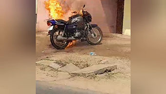 அதனைக் கண்ட அக்கம் பக்கத்தினர் தண்ணீரை ஊற்றியும், மண்ணை அள்ளி கொட்டியும் தீயை அணைக்க முயன்றனர். ஆனால் மோட்டார் சைக்கிள் முழுவதுமாக எரிந்து தீயில் கருகியது.