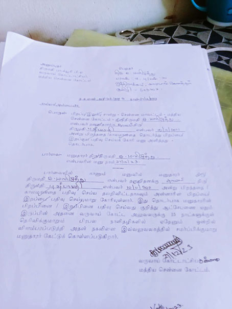 அவரது மனுக்குறித்து யாருக்காவது ஆட்சோபனை இருக்கும் பட்சத்தில் இவ் விளம்பரம் வெளியிட்ட நாளில் இருந்து 15 தினங்களுக்குள் மத்தியச் சென்னை வருவாய் கோட்டாட்சியர் அலுவலகத்தில் தெரிவிக்கும் படி கேட்டுக் கொள்ளப் படுகிறது.