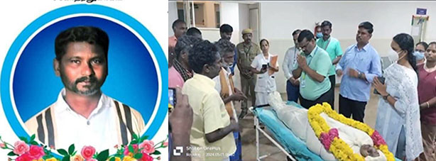 உடல் உறுப்புகள் தானமாக பெறப்பட்ட பெயிண்டரின் உடலுக்கு அரசு சார்பில் தஞ்சை மருத்துவக்கல்லூரி மருத்துவமனை முதல்வர் மலர் மாலை வைத்து அஞ்சலி செலுத்தினார்.